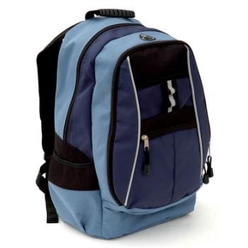 Deluxe Backpack 4 zippered compartments with inner CD holder pocket. 2 mesh side pockets. 100% polyester. size:. 17 "X 11" 9 "2 tone colors assorted: Navy / Light Blue, Navy / Red and Navy / Grey ..