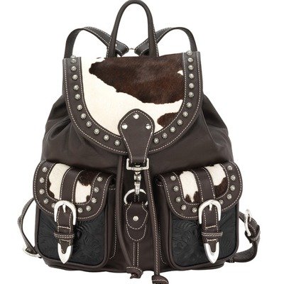 PONY516 Features:-Cotton lining.-Backpack with drawstring.-Unusual trigger latch closures.-Hand crafted vegetable tanned rich brown leather.-Brown chrome leather body and white printed cowhide hair-on flaps.-Zip at the back with a comfortable hand held strap.-Each piece is handmade, adjustable straps fit for a time.-Long on all sizes bodies.-Two outside front pouch pockets with decorative buckle and snap sets closures. Two-in pockets and inside zip compartments . Includes:.