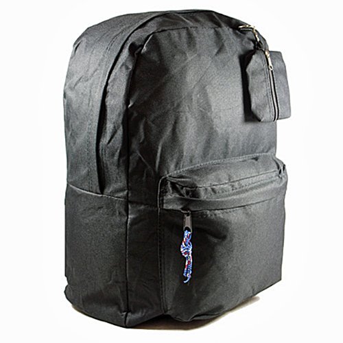 600 denier polyester backpacks are 17 x 12 x 6.5 inches. Large main compartment with outer zip pocket and detachable zip pouch. Sturdy zippers and reinforced zippers. Black only. You will receive 24 backpacks ..