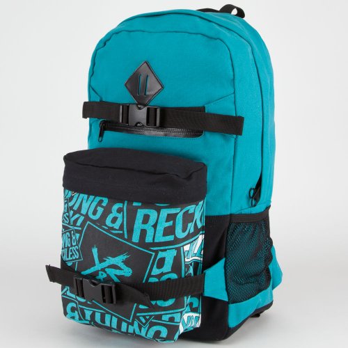 Young & Reckless Ranger backpack. Large main compartment with small internal mesh pocket and padded laptop sleeve divider. Small front pocket with allover Y & R logo collage. Skateboard straps on the front. Mesh side pockets. Padded pack panel. Padded shoulder straps with Y & R logo patch. Approx dimensions:. 19 "x 11" x 7 "(48.5cm x 28cm x 18cm) Imported ..